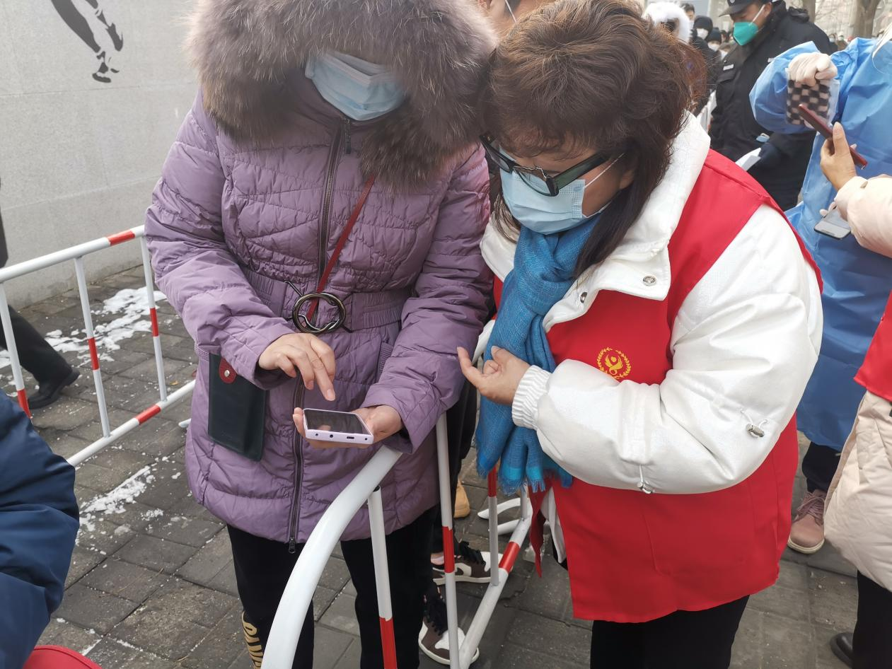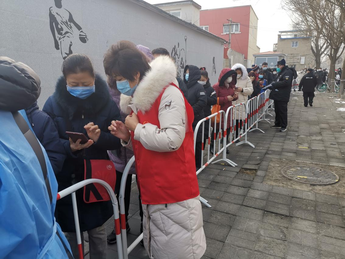 联合会常务副会长陈志斌,副会长、丰台区人大常委会原党组成员、副主任王百玲,副监事长、市女企业家协会会长安钟岩,候补理事、北京意馨明辉国际文化艺术发展有限公司总经理曹明明,4位市区两级人大代表身穿慈善义工“红马甲”,以普通党员慈善义工身份,在核酸检测站点进行扫码登记、维护现场秩序的工作,他们态度和蔼、工作细致,认真指导排队居民如何进行预约码操作,大大加快了居民排队等候的时间。同时,她们耐心向居民们宣讲此次大规模全民核酸筛查的重要意义,安抚居民的紧张情绪。在他们的作用带动下,现场其他志愿者、社区工作人员和医护人员密切配合,工作流畅。