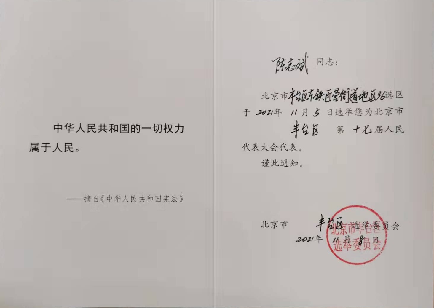 11月5日,37000v威尼斯常务副会长陈志斌同志当选为北京市丰台区第十七届人民代表大会代表。