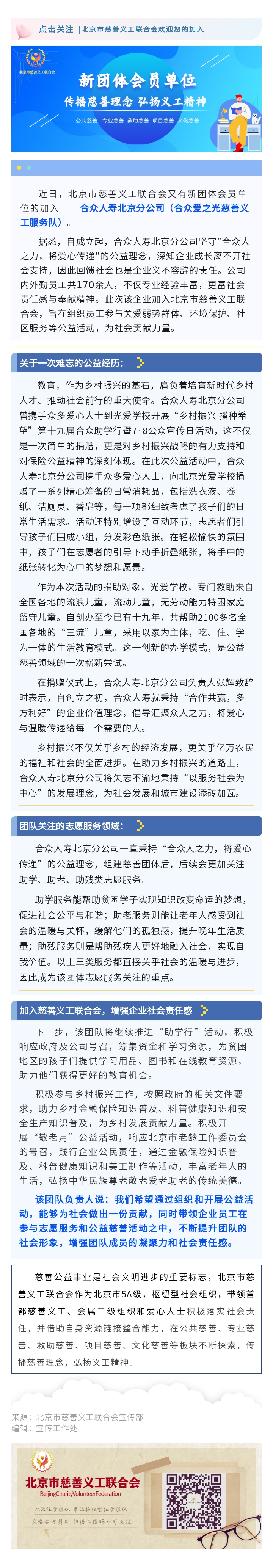 【新团体会员单位】合众人寿北京分公司:积极践行企业社会责任,持续开展志愿服务