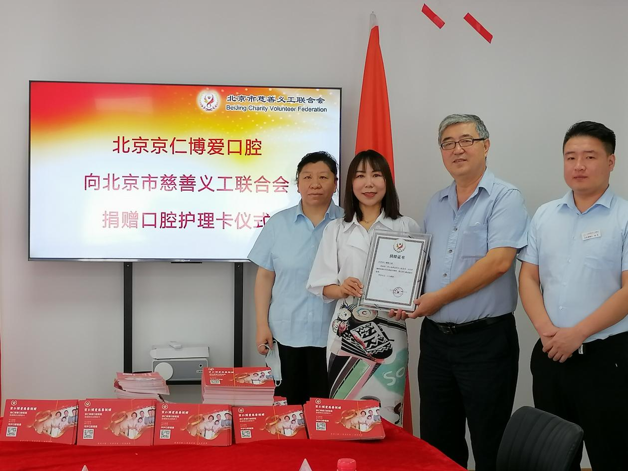 今天(8月19日)上午,京仁博爱口腔医院向我会捐赠口腔护理卡1000份,用于慈善公益事业,我会副会长王骏为京仁博爱口腔医院院长刘婧女士颁发捐赠证书。
