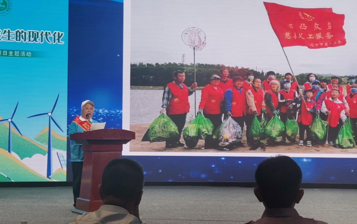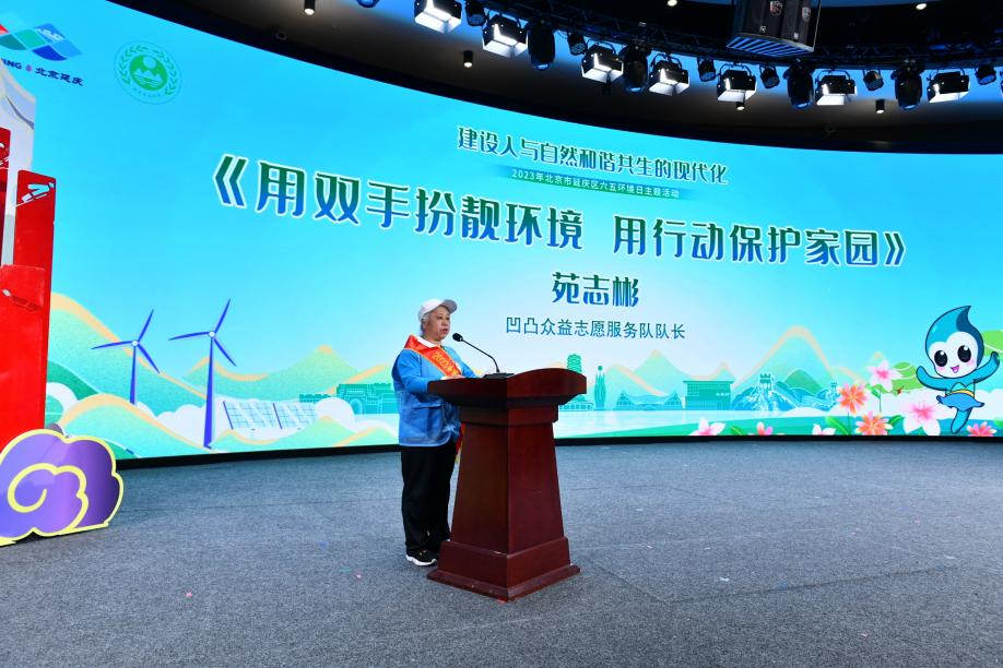 6月5日,在北京市延庆区六五环境日“建设人与自然和谐共生的现代化”主题活动启动仪式上,来自37000v威尼斯凹凸众益慈善义工服务队的苑志彬队长获“2023年度延庆区优秀生态环境志愿者”荣誉,并现场以《用双手扮靓环境,用行动保护家园》为题作精彩分享。
