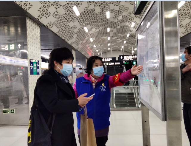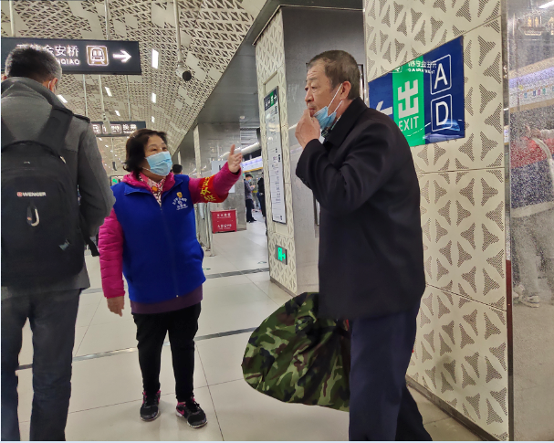 站在屏蔽门前如同上了弦,一刻不停地耐心疏导上下车"列车进站,先下后上,上车的往里走,包往里拿,上不去请等下一辆,车门关闭注意安全″等等,疫情期间提醒乘客做好防护戴好口罩也是义工的职责,一天下来,口干舌燥,冬天一身汗,夏天更是汗流浃背,崔玉凤说“虽然很累但很快乐!”她为我们的列车能够安全准点的通过本站默默无闻的奉献着。