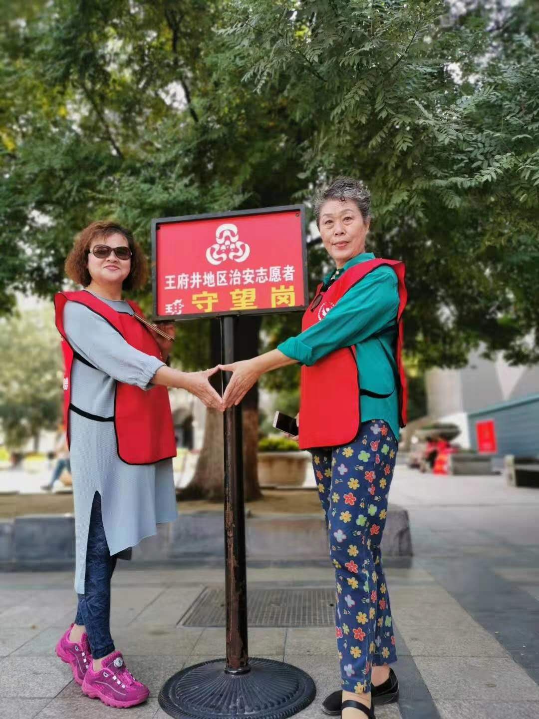李兰英站在‘’王府井地区治安志愿者‘’标牌下站岗执勤。不负使命与责任!我爱你中国!我爱你北京!