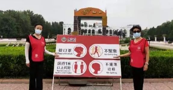 宏利慈善义工服务队的义工队员引导大家遵守疫情防控规定