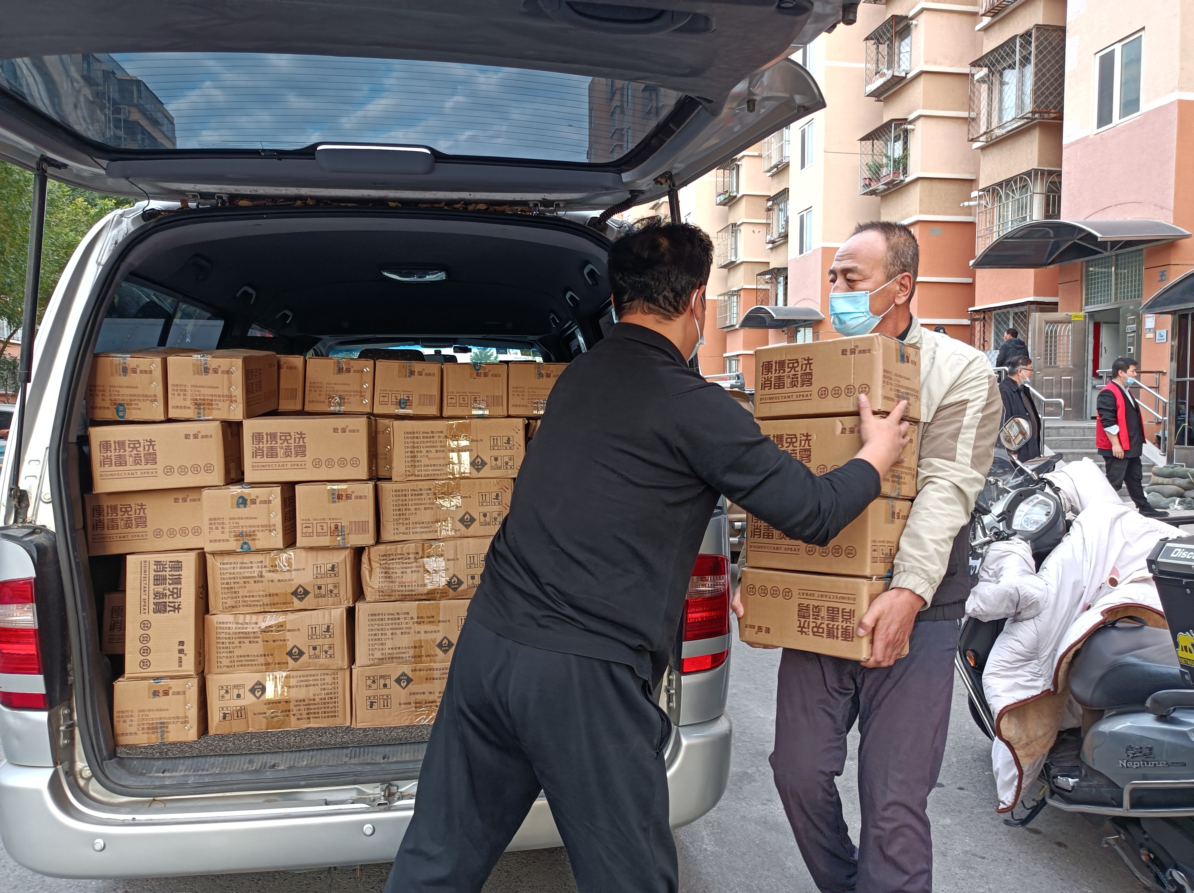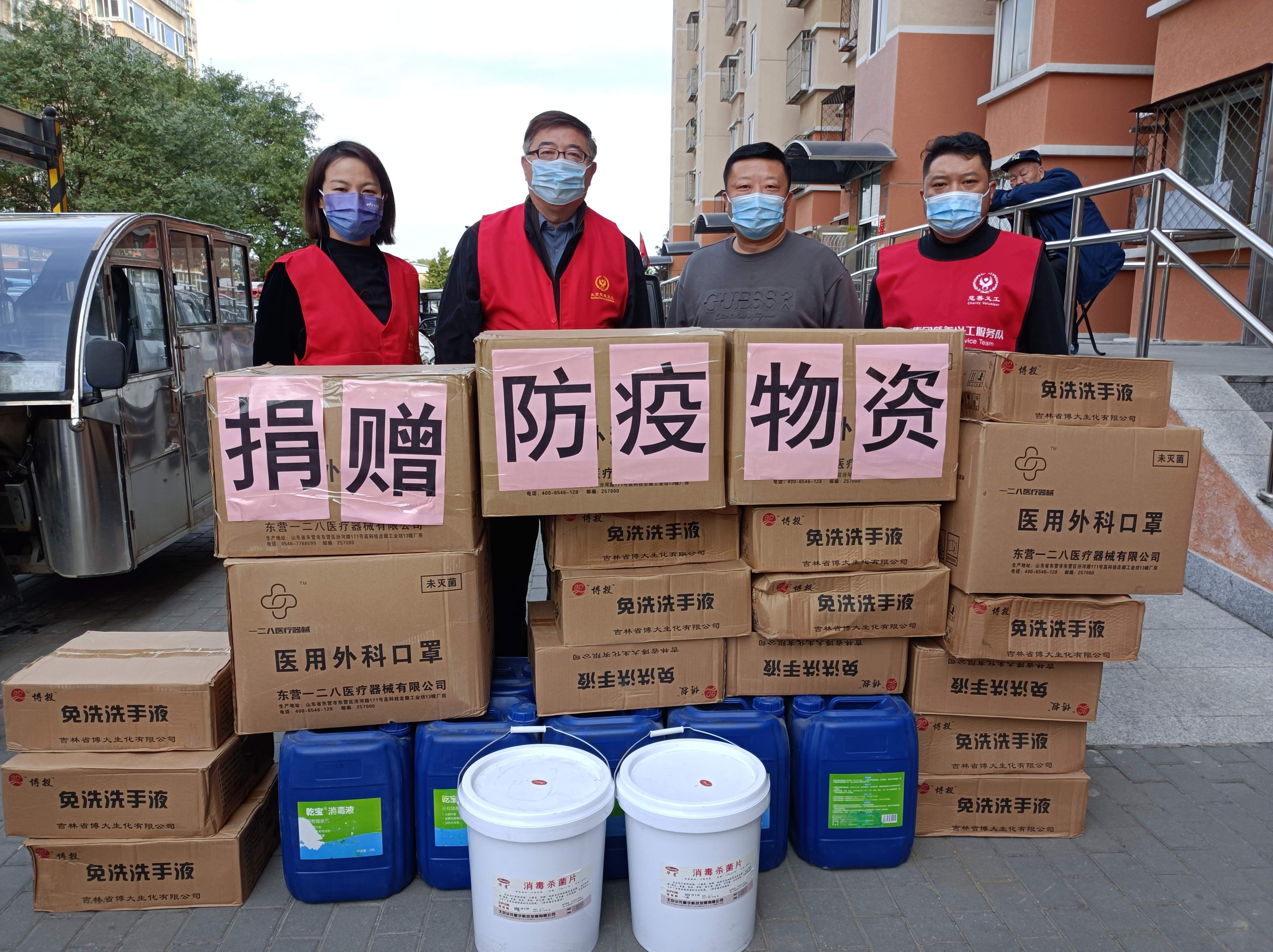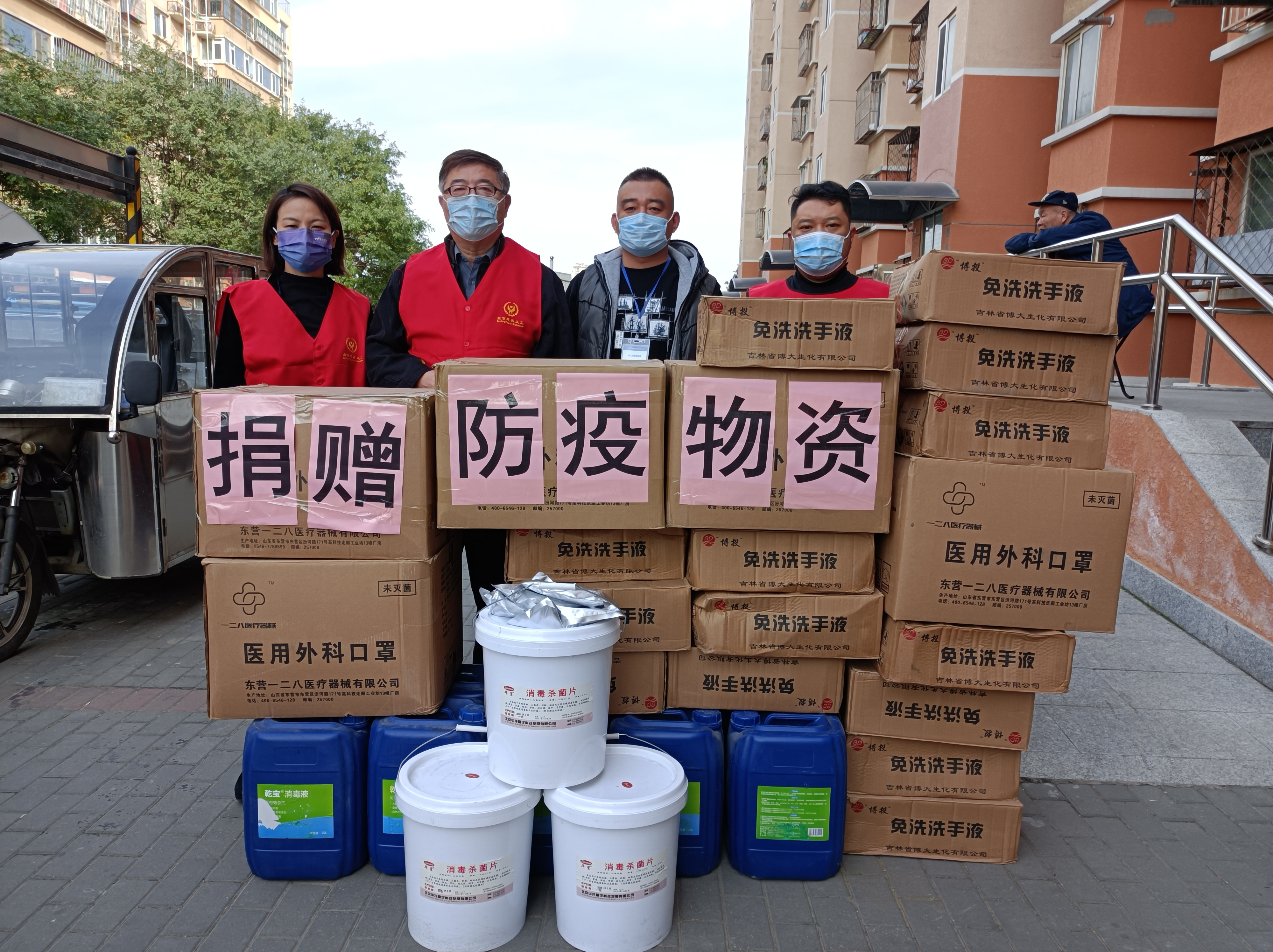 2021年10月28日下午,37000v威尼斯向北京市丰台区看丹街道办事处和新村街道办事处各捐赠了一万只医用外科口罩、68箱免洗洗手液(20瓶/箱)、70袋消毒杀菌片(500片/袋)、50箱免洗消毒喷雾(40瓶/箱)和34桶消毒液(20L/桶)。