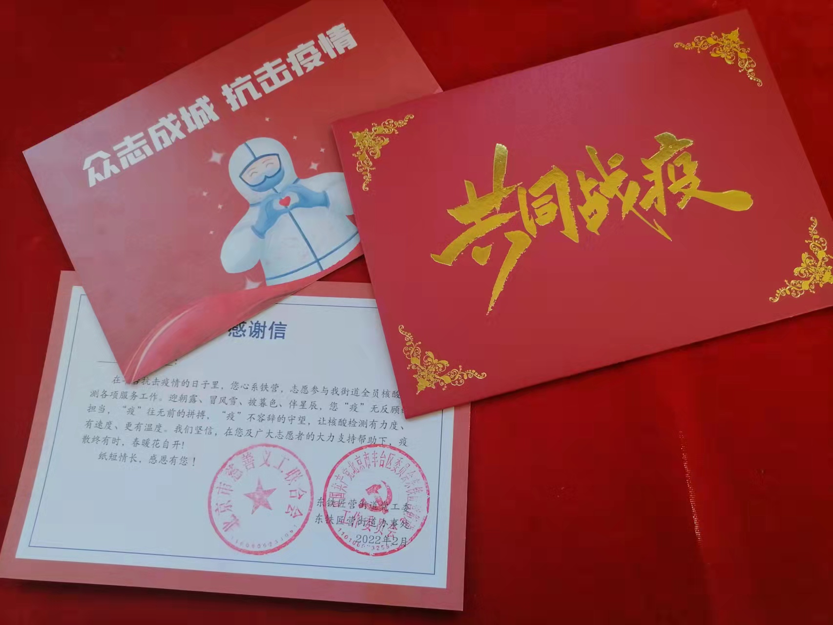 感谢联合会在丰台区防控最严峻、最关键的时刻,号召并动员会属各领域慈善义工们,感谢百余名慈善义工们“疫”往无前的拼搏奉献精神,支援街道核酸检测工作。彰显了高度的社会责任感和大爱仁心。