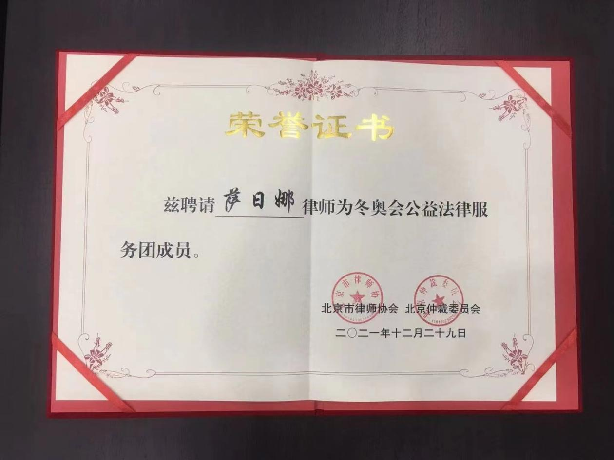 2022年4月10日,北京市司法局召开对全市司法行政系统冬奥会冬残奥会安保维稳总结及表彰颁奖会议,萨日娜律师被评为“优秀卫士”。萨日娜律师充分发挥专业之长,以法治为冬奥护航,生动诠释了北京律师的使命与担当。