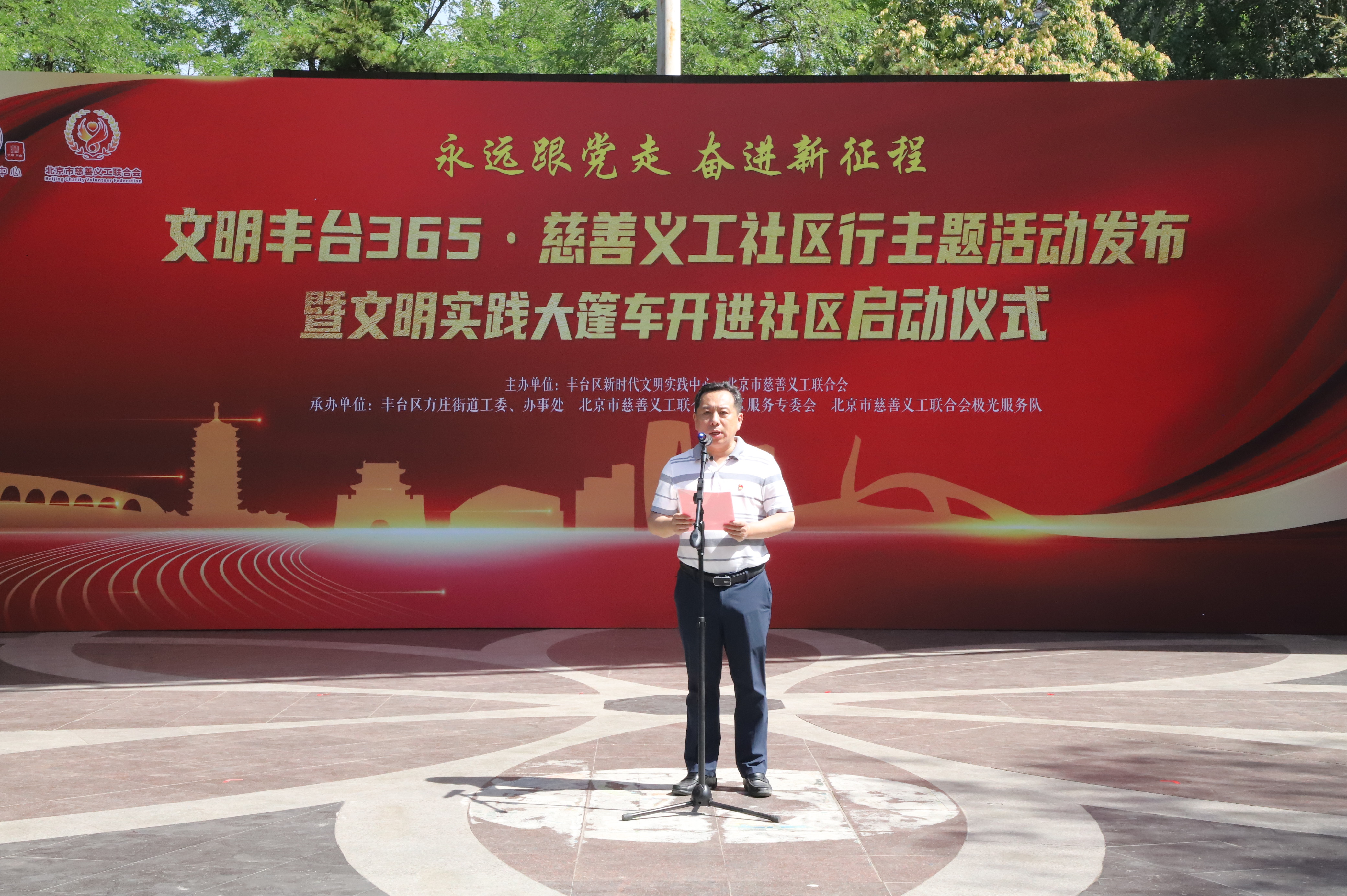 今天,我们在这里共同举办永远跟党走,奋进新征程“文明丰台365慈善义工社区行”主题活动发布会,共同启动“文明实践大篷车”进社区活动。首先,我代表方庄街道工委、办事处、新时代文明实践所,向首都文明办、市慈善义工联合会、丰台区委宣传部的各位领导、慈善义工朋友以及居民们表示衷心的感谢和热烈的欢迎。