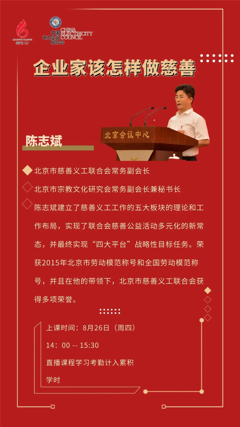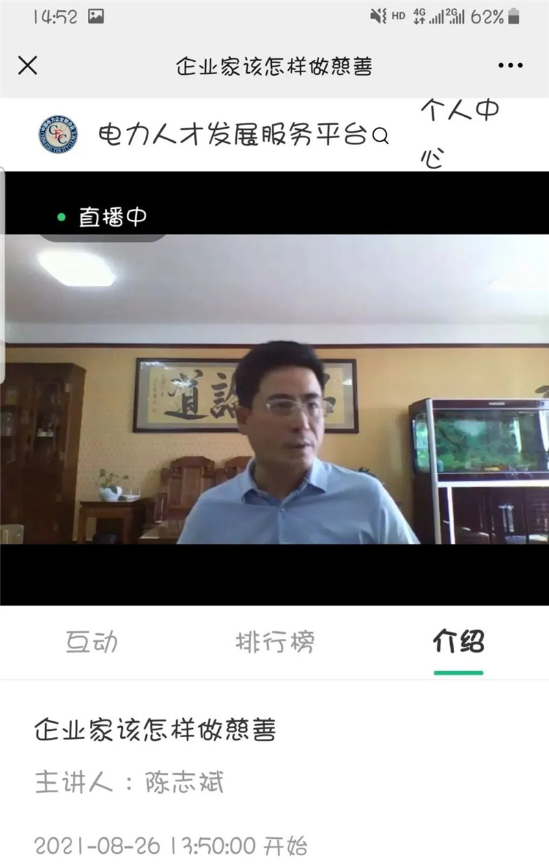 8月26日下午,联合会常务副会长陈志斌做客中国电力企业联合会在线培训平台,就“企业家该怎样做慈善”在线直播。