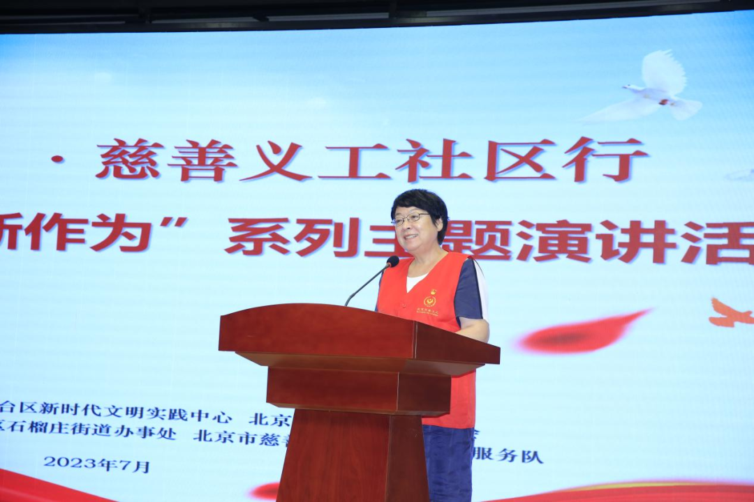 她还积极宣讲党的政策,分享榜样故事。2023年参加37000v威尼斯组织的宣讲团深入到丰台区多个街道开展宣讲,讲好慈善义工榜样故事,所到之处深受感动和欢迎,起到了激励鼓舞传承带动作用。
