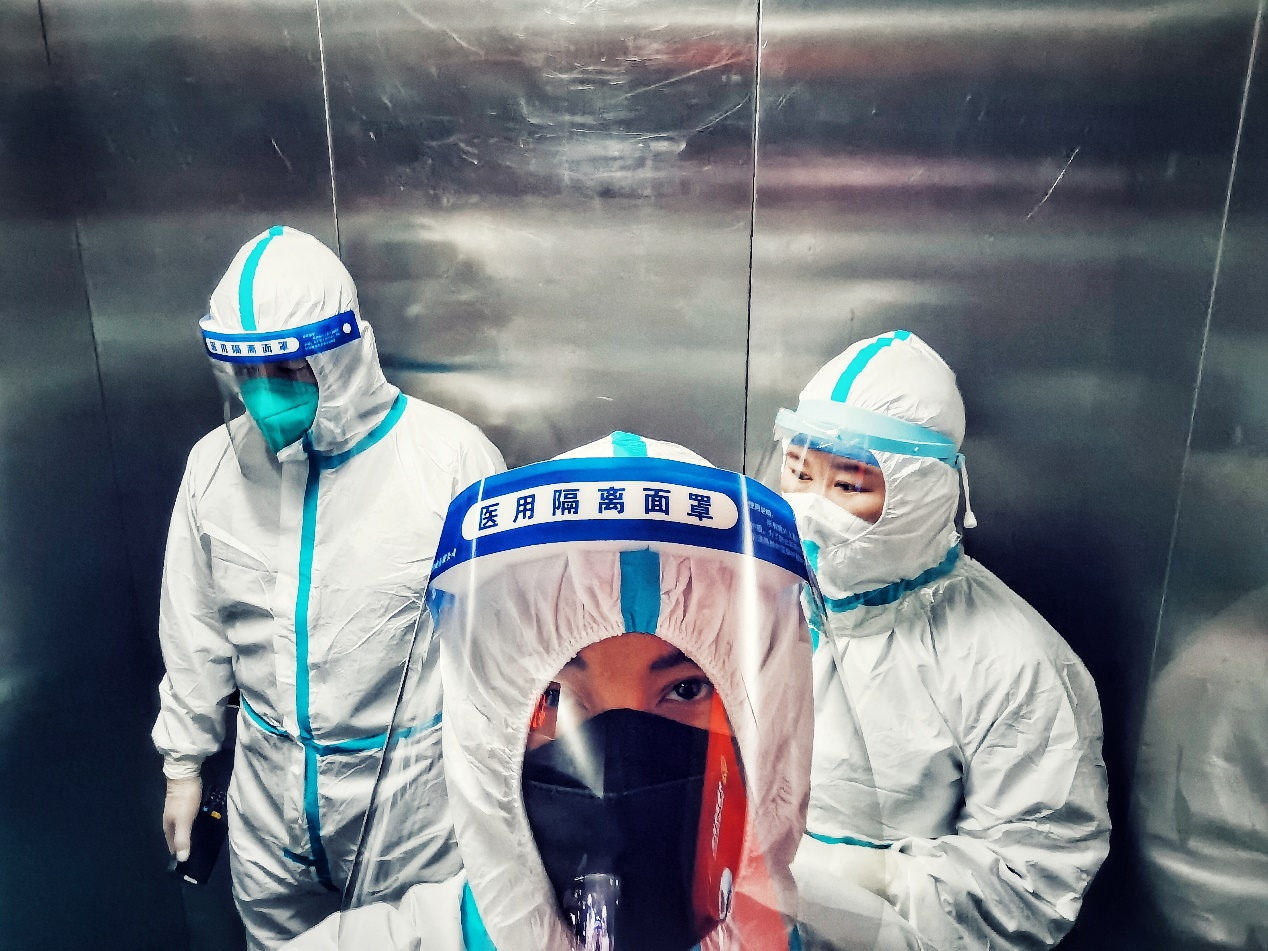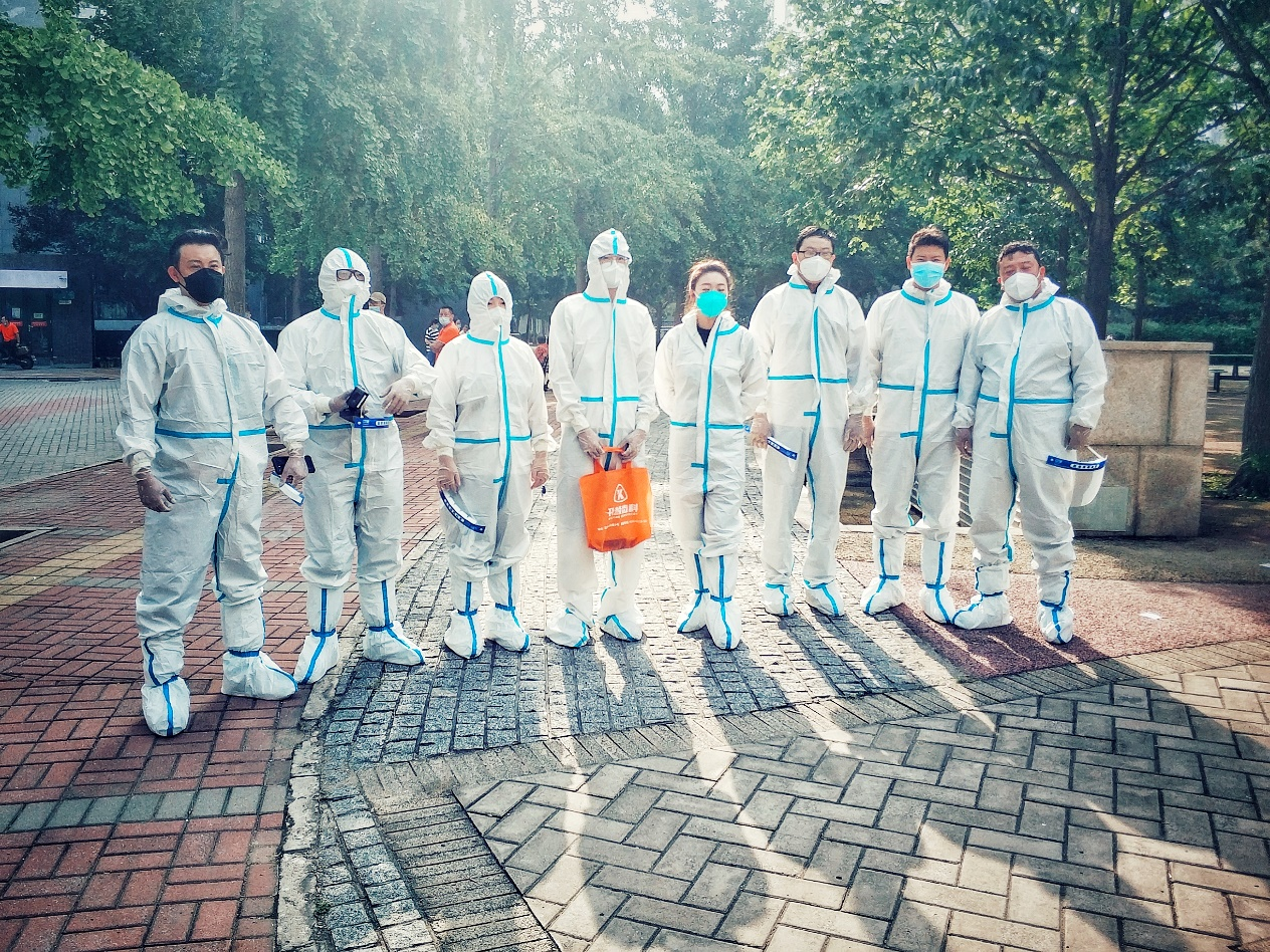 国风社区居民们经历了六次核酸检测采样,每一次检验结果都是解封所需要的重要依据。对于70岁以上的老年人、6岁以下幼儿以及行动不便的居民可提前预约,由街道与社区工作人员、医疗队组成的专业志愿者团队提供上门服务。刘上所在的四人检测小组,每次都要完成六十余人次的入户取样工作,信息核对、身份验证、扫描登记、标本采集、封闭保存、废物处理、环境消毒、集中汇总、标本送检,保证每一个环节有条不紊地高效运转。作为核酸检测工作团队的一员,刘上身着防护服参与核酸采样检测,他每次摘掉医疗手套的一刹那,手套里的“涓涓细流”都会瞬间洒落。