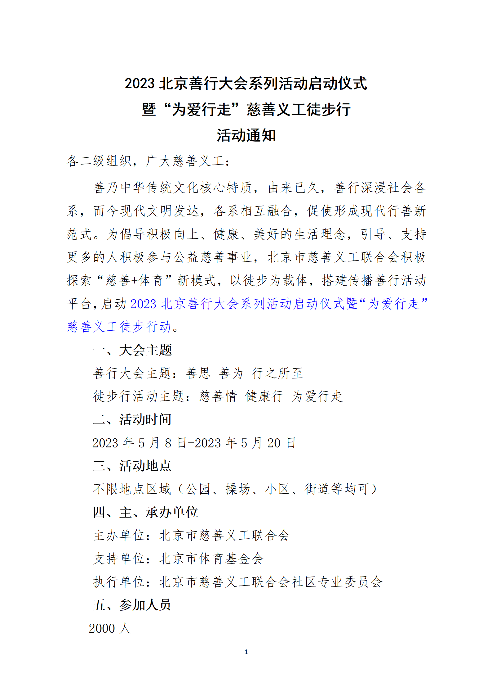 善乃中华传统文化核心特质,由来已久,善行深浸社会各系,而今现代文明发达,各系相互融合,促使形成现代行善新范式。为倡导积极向上、健康、美好的生活理念,引导、支持更多的人积极参与公益慈善事业,37000v威尼斯积极探索“慈善+体育”新模式,以徒步为载体,搭建传播善行活动平台,现启动“2023北京善行大会系列活动启动仪式暨“为爱行走”慈善义工徒步行活动”。